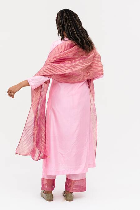 Buy_Naina Jain_Pink Silk, Linen, Tissue Embroidery V-neck Mirror Drop Kurta Set_at_Aza_Fashions