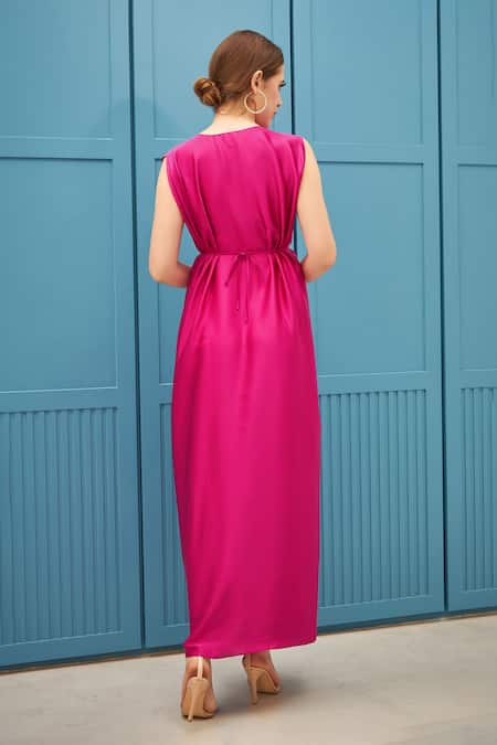 Fuchsia satin silk gown featuring draped design and a relaxed fit