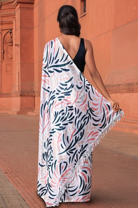 A white chinon pre-draped saree featuring an abstract print in shades of peach and dark teal with fringed edges. It is paired with a black heavy art silk stitched blouse.