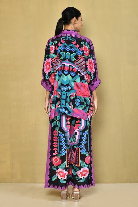 Multi Color Crepe Collared Abstract Print Shirt And Pant Set