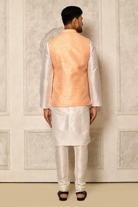 Peach bundi with chevron pattern. Paired with white kurta and churidar.