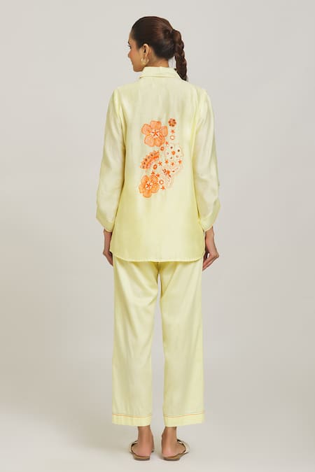 Yellow shirt featuring placed floral dori embroidery and matching pants. The shirt has a shirt collar, three-quarter sleeves, and is made from Chanderi with a lining of Mulmul.
