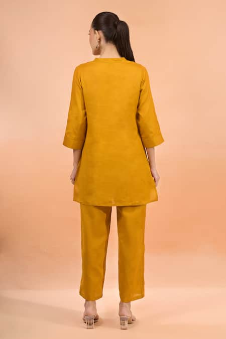 Mustard Cotton, Linen Embroidery Split V-neck Kurta And Pant Set