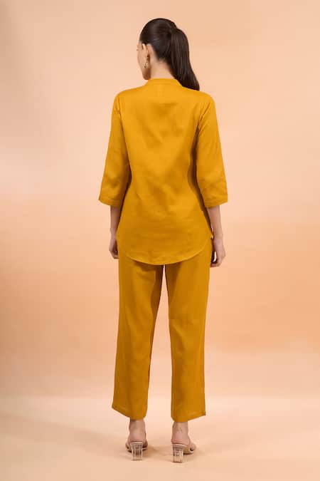 Mustard Cotton, Linen Embroidery Mandarin Collar Kurta And Pant Set