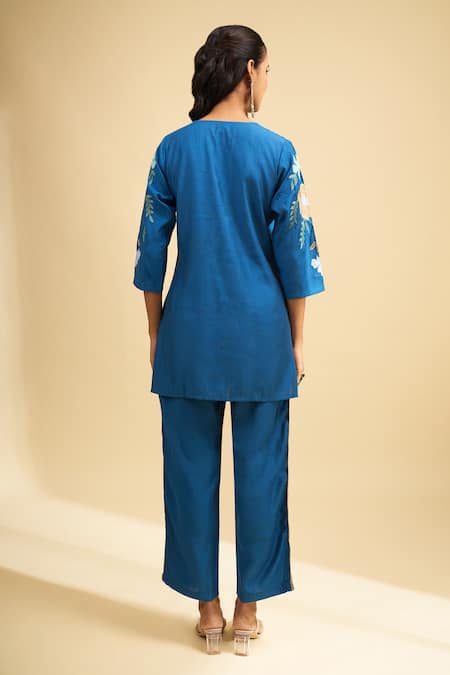 A teal silk kurta featuring floral embroidery with a V-neck and three-quarter sleeves. It is paired with coordinating teal silk pants with an elasticated waist.