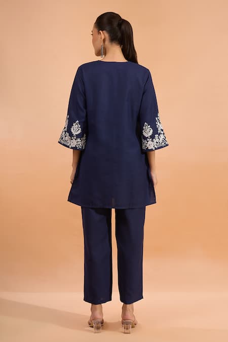 Navy Cotton, Linen Embroidery Split V-neck Floral Kurta And Pant Set