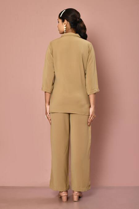 Buy_Naintara Bajaj_Beige Italian Fabric Floral Shirt Collar Motif Kurta And Pant Set