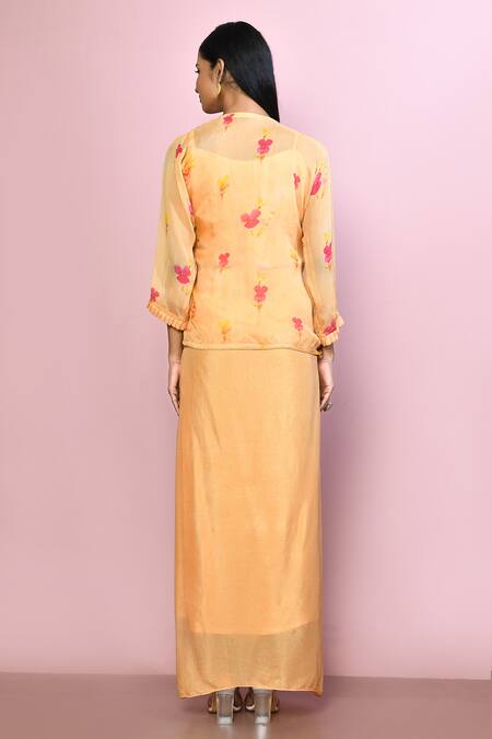 Buy_Naintara Bajaj_Yellow Chiffon, Lining Polyester Cutdana, Floral Print Draped Skirt Set_Online_at_Aza_Fashions