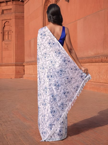 A white chinon pre-draped saree featuring a printed floral pattern with blue motifs. It is paired with a royal blue heavy art silk stitched blouse.