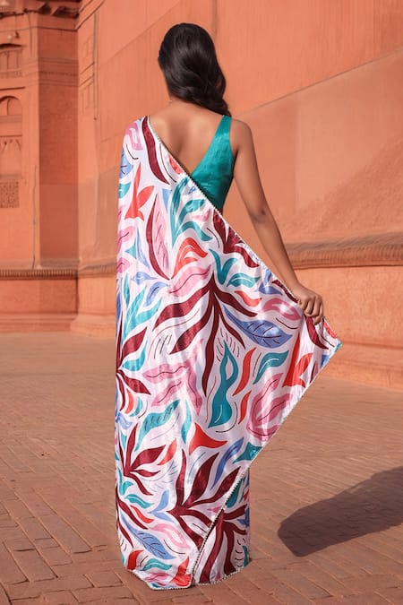 Pre-draped saree for easy wear, All-over leaf print design, Deep V-neckline on blouse