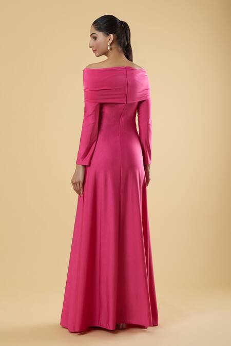 Pink Polyester Solid Off Shoulder Overfold Full Sleeve Maxi Dress
