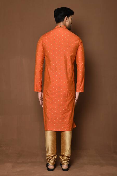Orange kurta base featuring contrast brocade patterns all over it with embellished placket. Comes with a solid gold churidar.