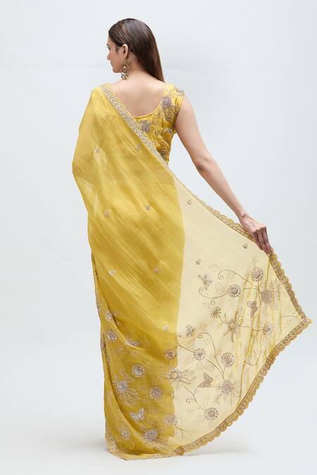 Yellow saree featuring floral gota hand work highlighted with moti & dabka work. Paired with a coordinating blouse with attached lining.