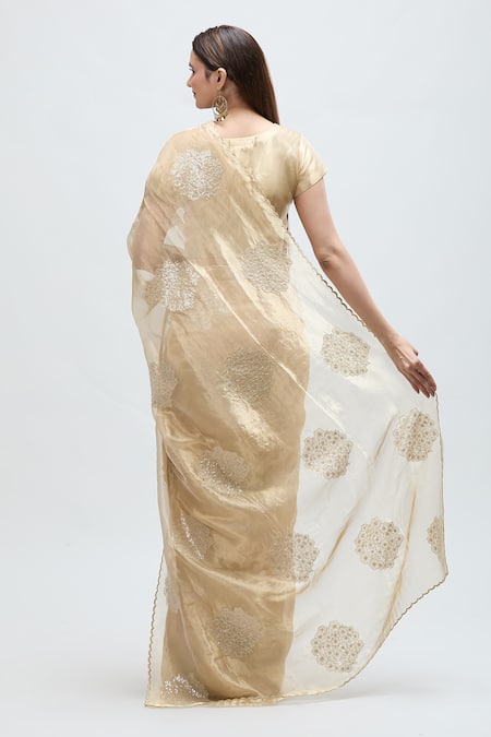 Gold tissue saree featuring floral zari embroidered buti work all over. Paired with a solid blouse with front hook & eye closure.
