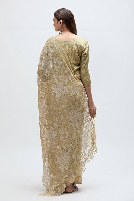 Attached lining in the saree, Floral zari embroidery all over, Pintuck detailing on the blouse