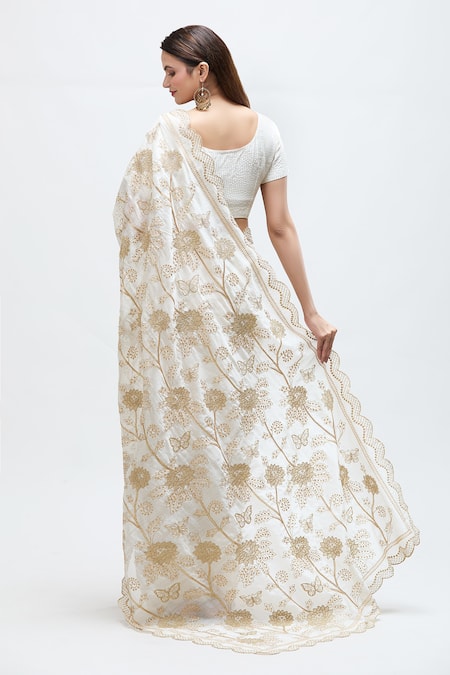 Off white saree featuring floral, zari, thread work and sequin handwork with scallop hem. Paired with a pintuck detailed blouse.