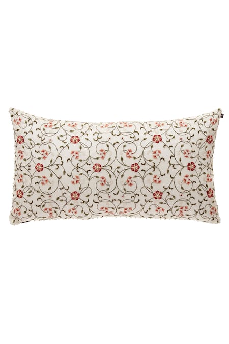 Off-white rectangle-shaped cushion cover with all-over floral motif resham, badla work. Comes with filler.