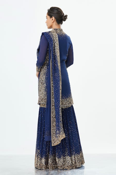 Navy blue straight short kurta with placement gold-tone sequin work. Comes with embellished sharara pants & dupatta.