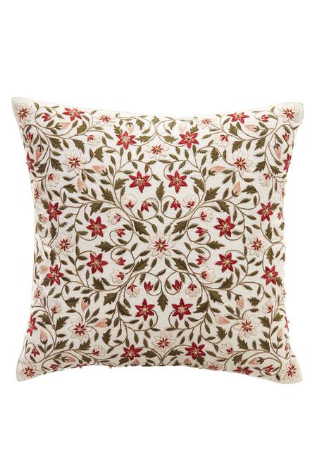 Off-white square-shaped cushion cover with all-over floral motif resham, zari work. Comes with filler.
