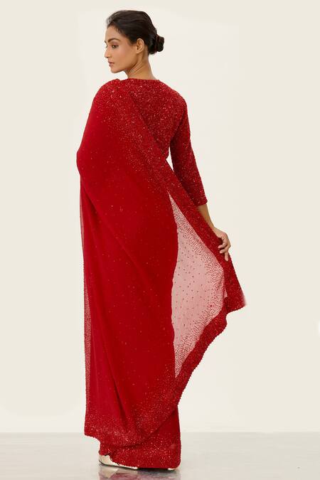 Buy_Nakul Sen_Red Chiffon Sequin Embellished Saree With Blouse_Online_at_Aza_Fashions