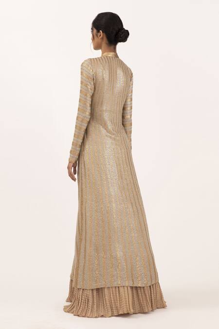 Beige long jacket with all-over sequin embroidery in a striped pattern and loop button closure. Comes with crinkled gown.