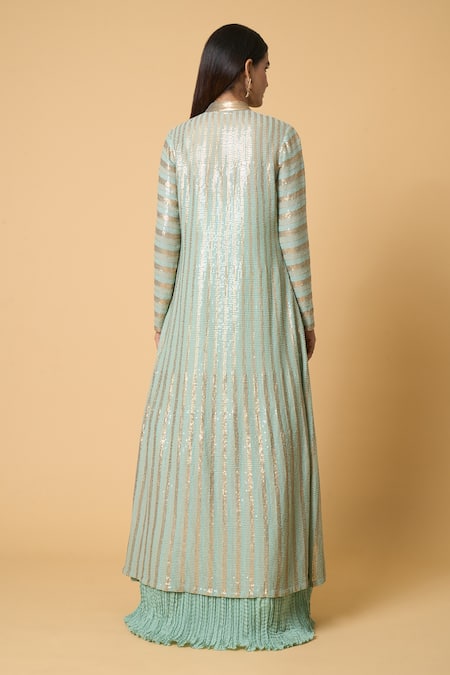 Blue sequined Anarkali featuring a crinkled texture and a side zipper. Paired with a longline jacket with striped sequin embroidery and a solid skirt with an elasticated waistband.