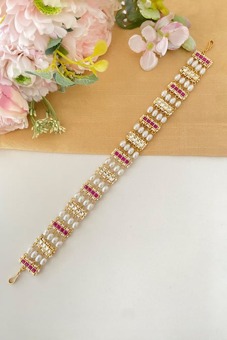 Micro gold plating for a luxurious finish, Combination of Kundan and pink stones, Delicate rice pearls for added elegance