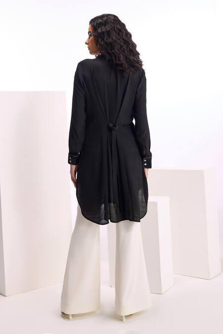 Black tunic featuring a band collar, full cuff sleeves, and floral embellishments. Paired with matching pants for a complete look.