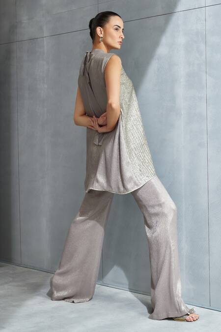Brown Shimmer Chiffon Embellished Sequin Applique Aspen Overlap Top And Pant Set