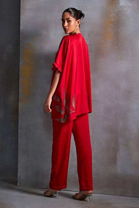 Scarlet red kaftan style top featuring round neckline and sequin calathea embroidery. Paired with a matching straight pant for a complete look.