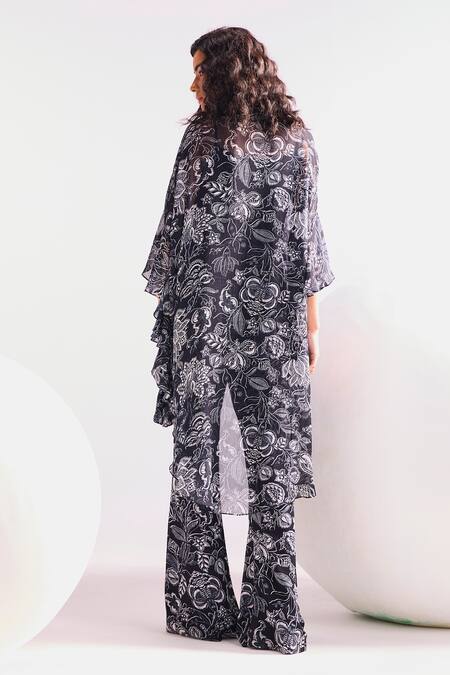 Black tunic featuring frilled batwing sleeves and hand embellished floral patterns. Paired with coordinating pant in a matching design.