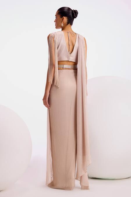 Cream pre-draped saree featuring crystal drop fringes on the palla. Accompanied by a scalloped tassel drop hand embellished blouse and a crystal drop embellished belt.