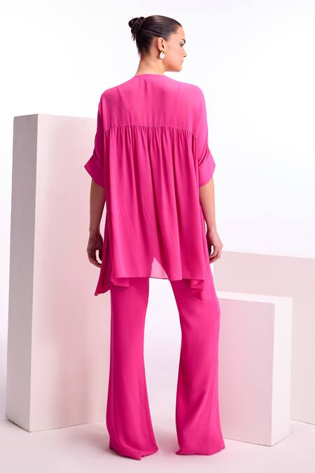Fuchsia gathered top featuring thread embroidery in floral placement pattern. Paired with matching flared pants for a coordinated look.
