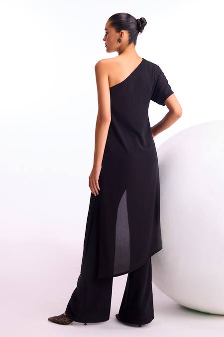 Black Textured Crepe Embellished Floral One Shoulder Nigella Top