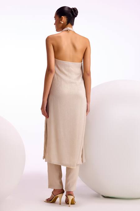 Champagne halter neck long top featuring floral sequin embroidery and a side slit. Paired with matching pants for a complete look.