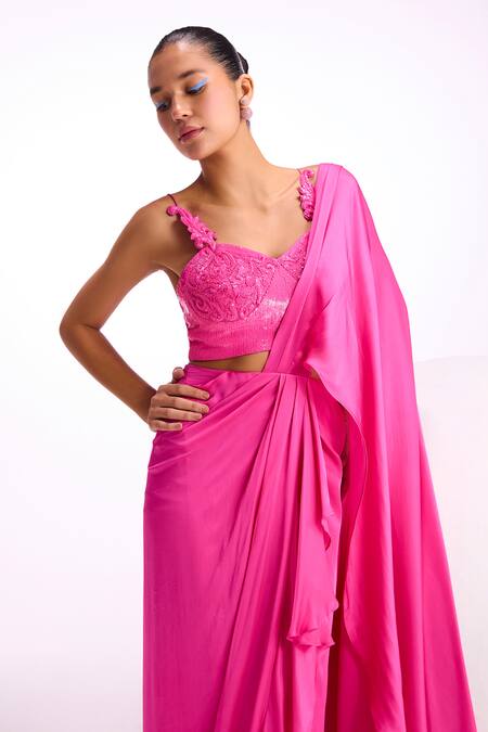 Fuchsia pre-draped saree featuring asymmetric front pleats. Paired with a hand embellished blouse adorned with tonal sequins and floral patterns.