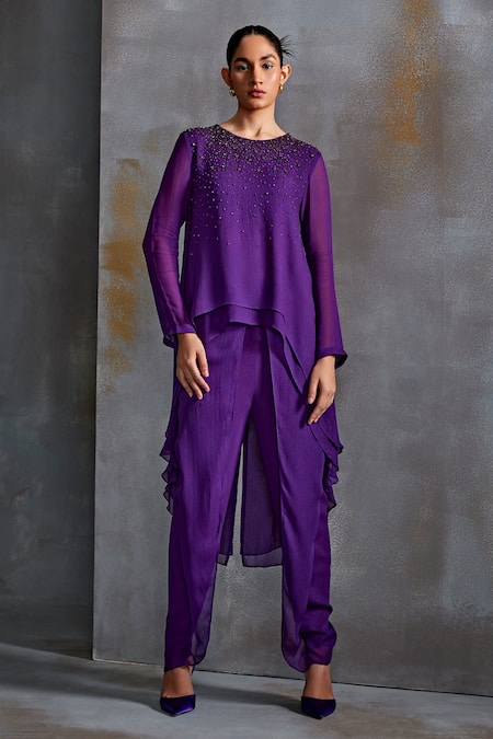 Purple high low tunic featuring full sleeves with spluttered sequin and crystals highlights. Paired with petal hem pant in textured georgette fabric.