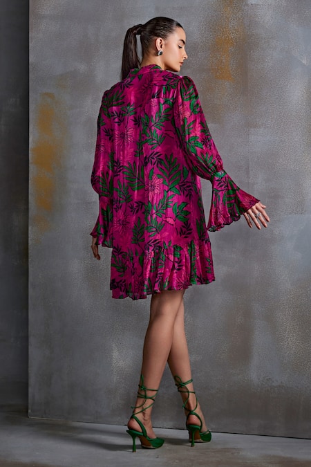 Magenta pink dress featuring angel sleeves, mandarin collar, and tie-up detail