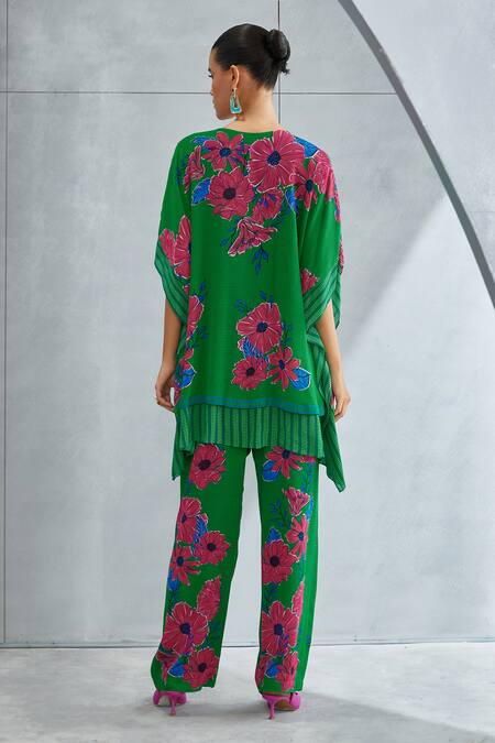 Green Georgette Embellished Sequin Round Zinna Floral Pattern Top And Pant Set