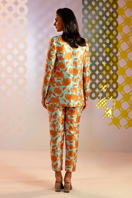 Aqua, orange double breasted blazer with abstract print and lapel collar.