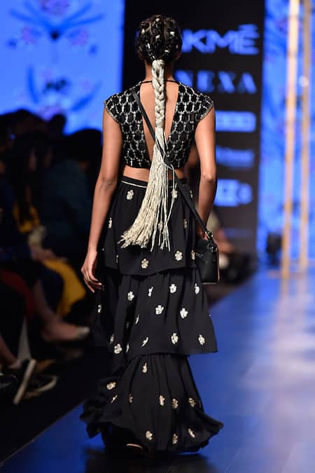 Black choli with all-over embroidered motifs and low back. Comes with layered sharara.
