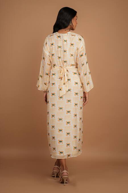 Shop_Nassh_Multi Color Silk V-neck Fawn Print Tie Up Dress_at_Aza_Fashions