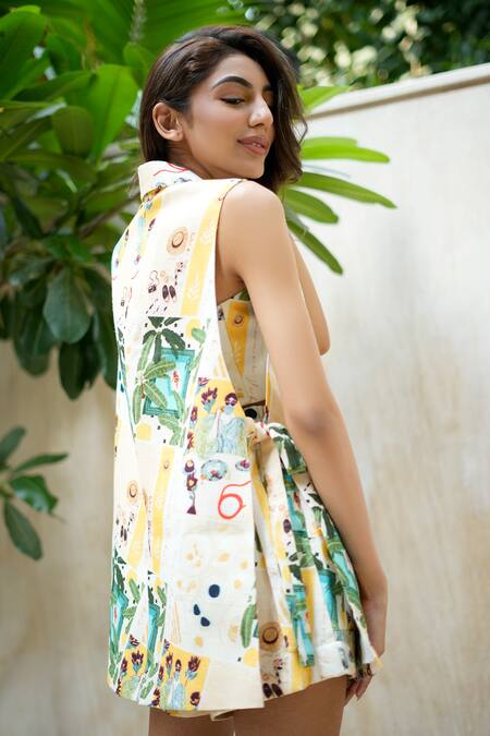 Multicolor printed shacket featuring a notched lapel collar and side tie-up detailing. Paired with a square neck printed top and shorts with side pockets.