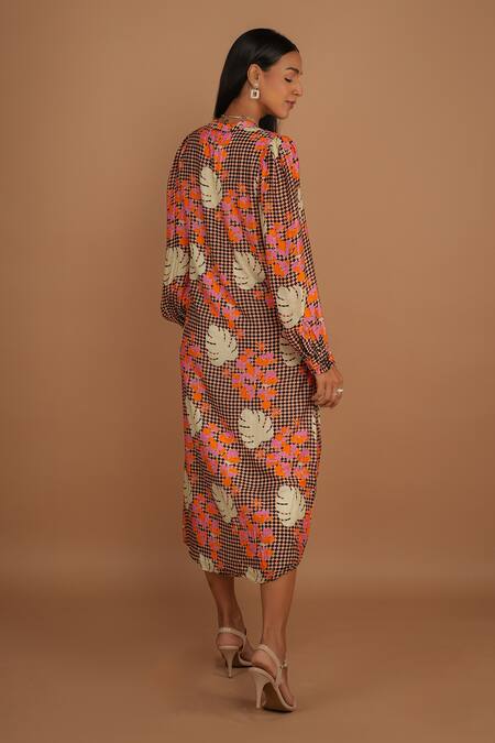 Multi Color Silk Mandarin Collar Serene Checker Print Midi Dress