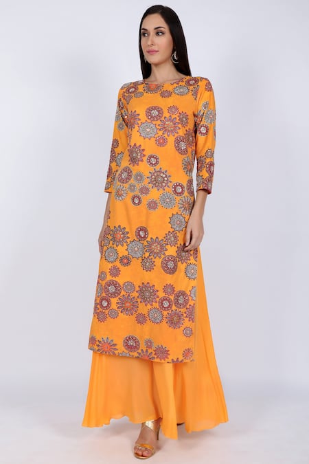 Mustard straight kurta with digital printed motifs & sequin embroidery. Comes with palazzo pants.
