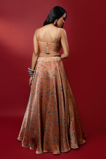 Mud pink crop top with zipper back & spaghetti straps. Comes with all-over florla printed lehenga.