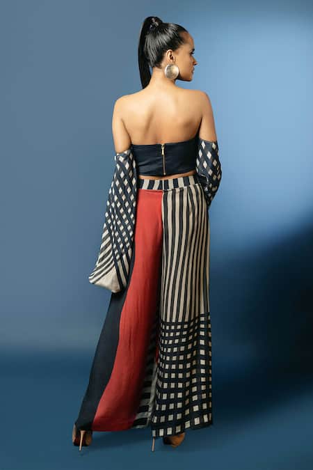 Grey-blue tube bustier-crop top with balloon sleeves & all-over print. Comes with multi-color side slit pants.