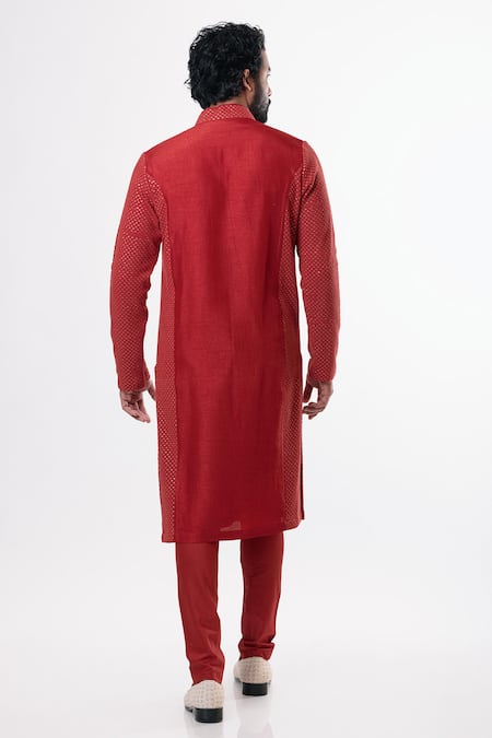 Crimson kurta with sequin embroidered motifs & front button placket. Paired with churidar.