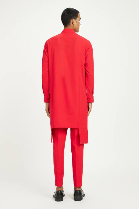 Red kurta featuring an asymmetric hemline, stand collar, and full sleeves. Paired with matching pants for a coordinated look.