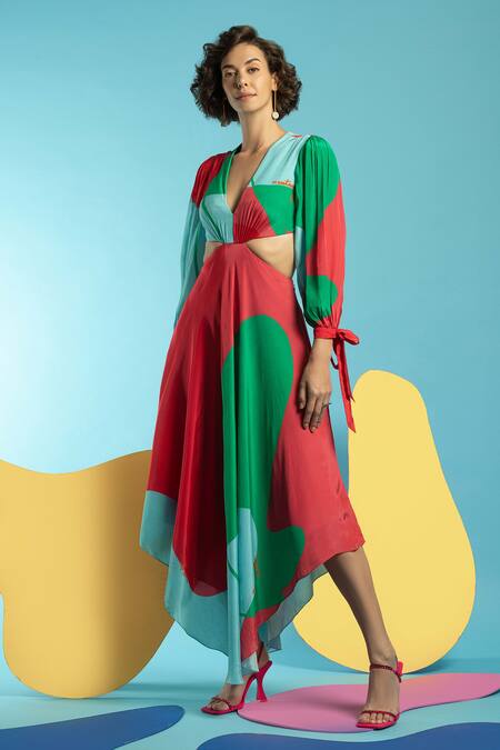Powder blue, green, hot pink natural crepe printed colourblock cutout dress.